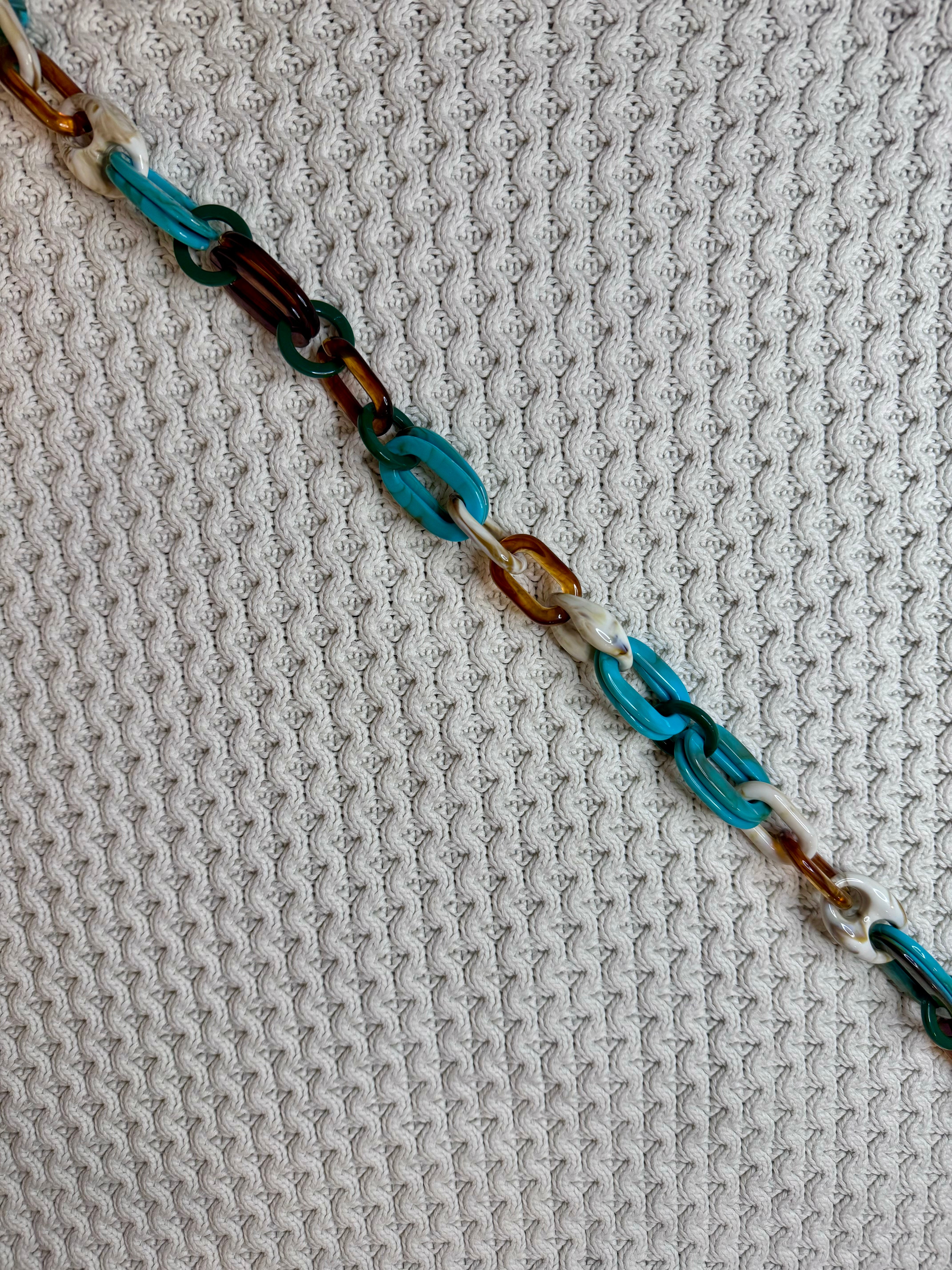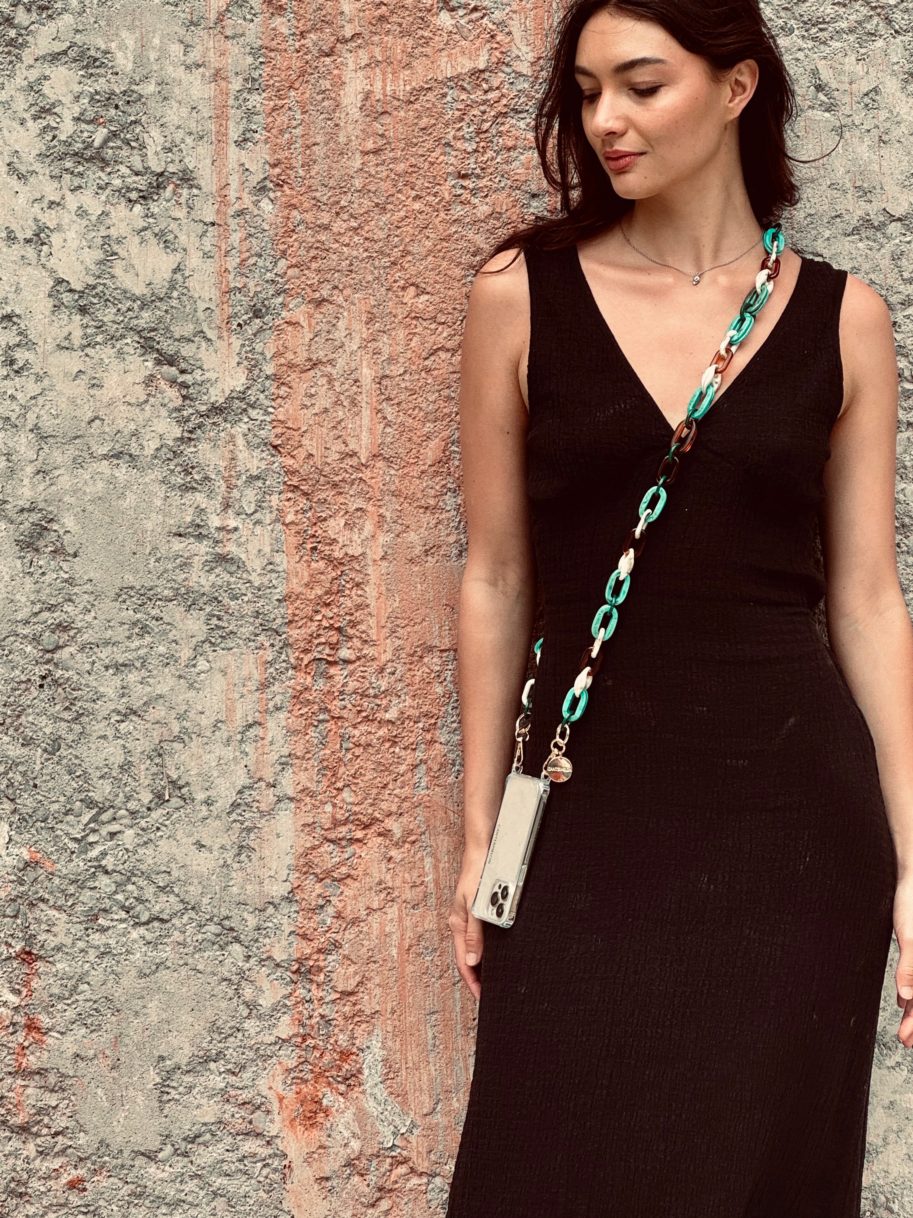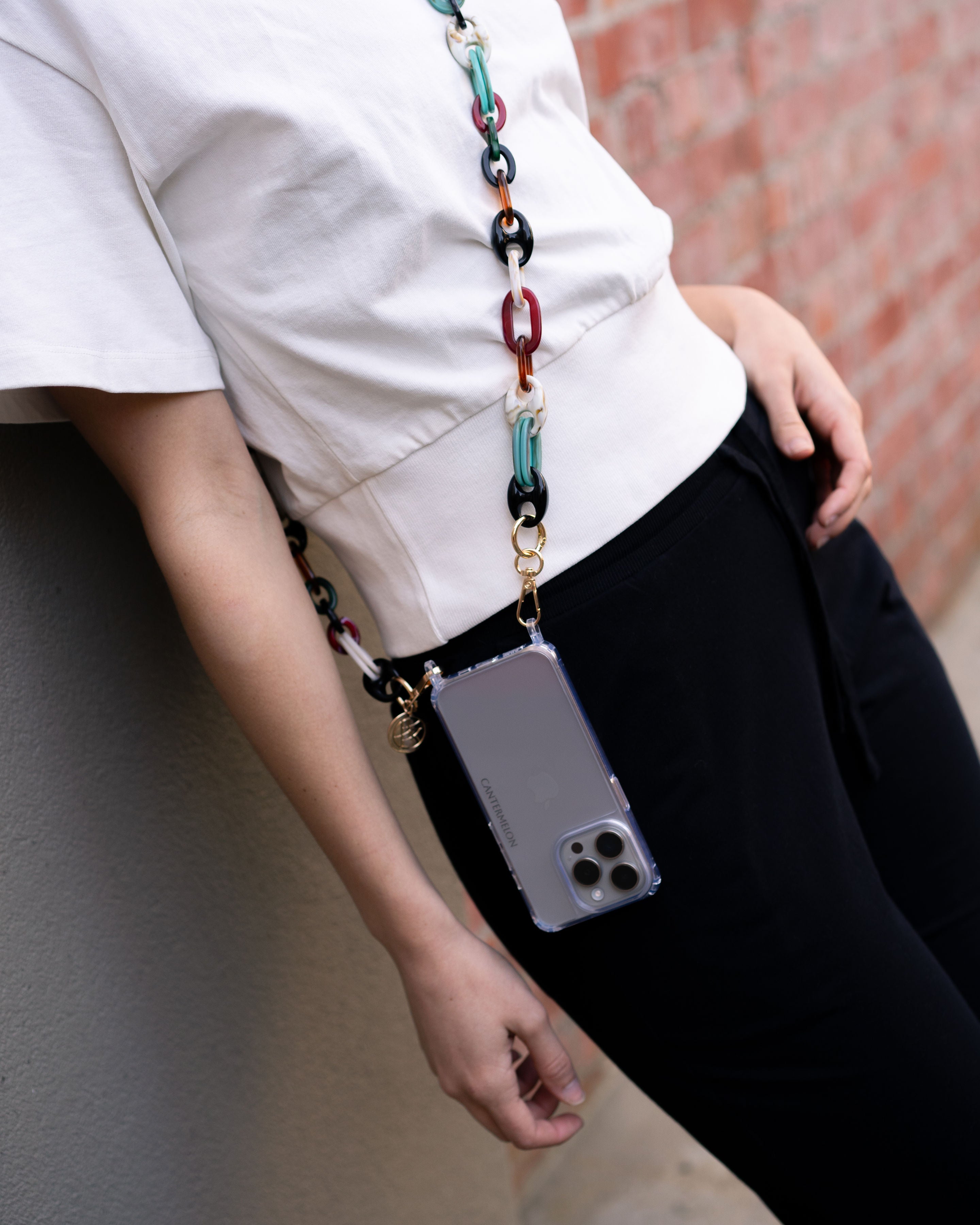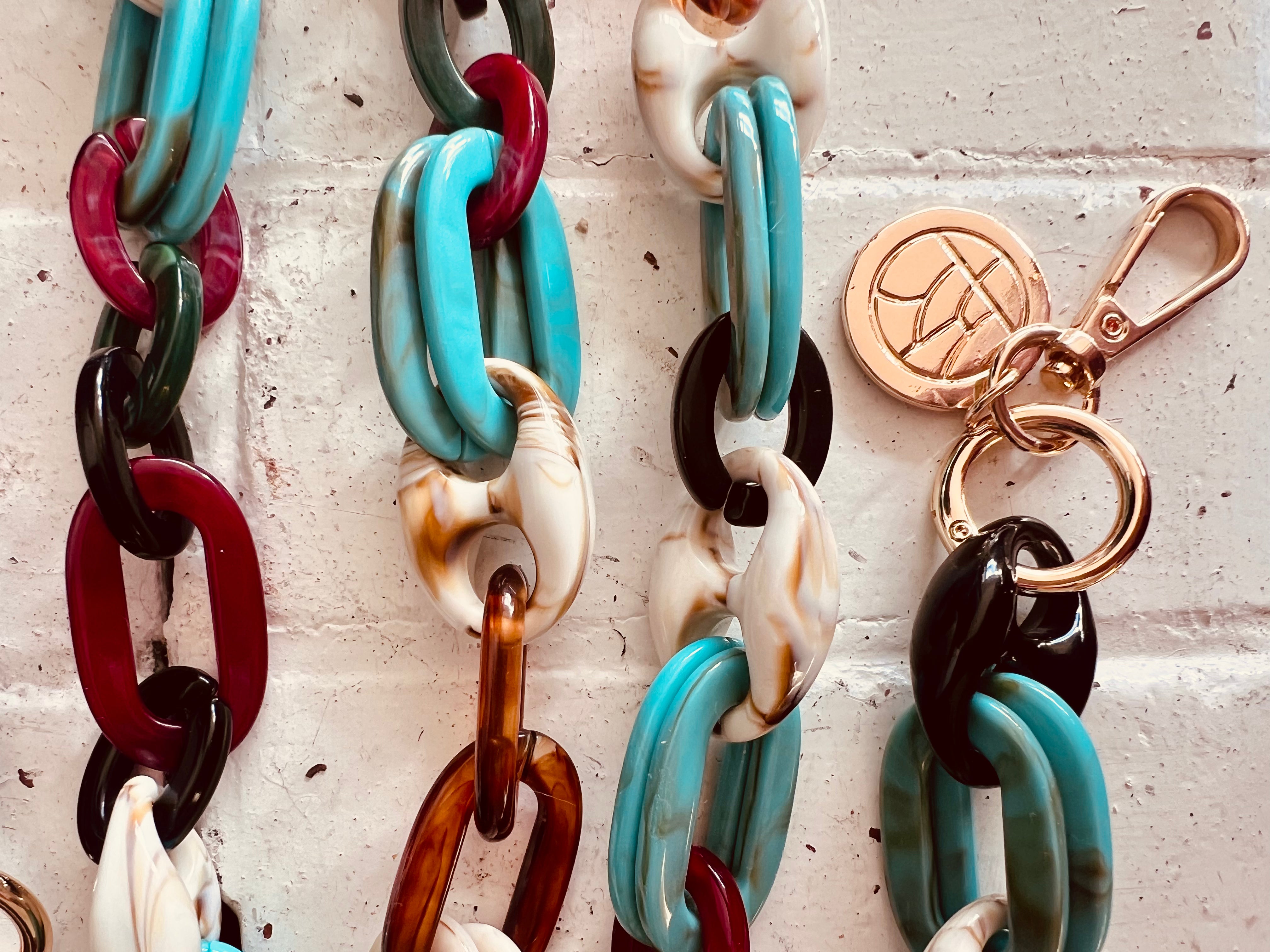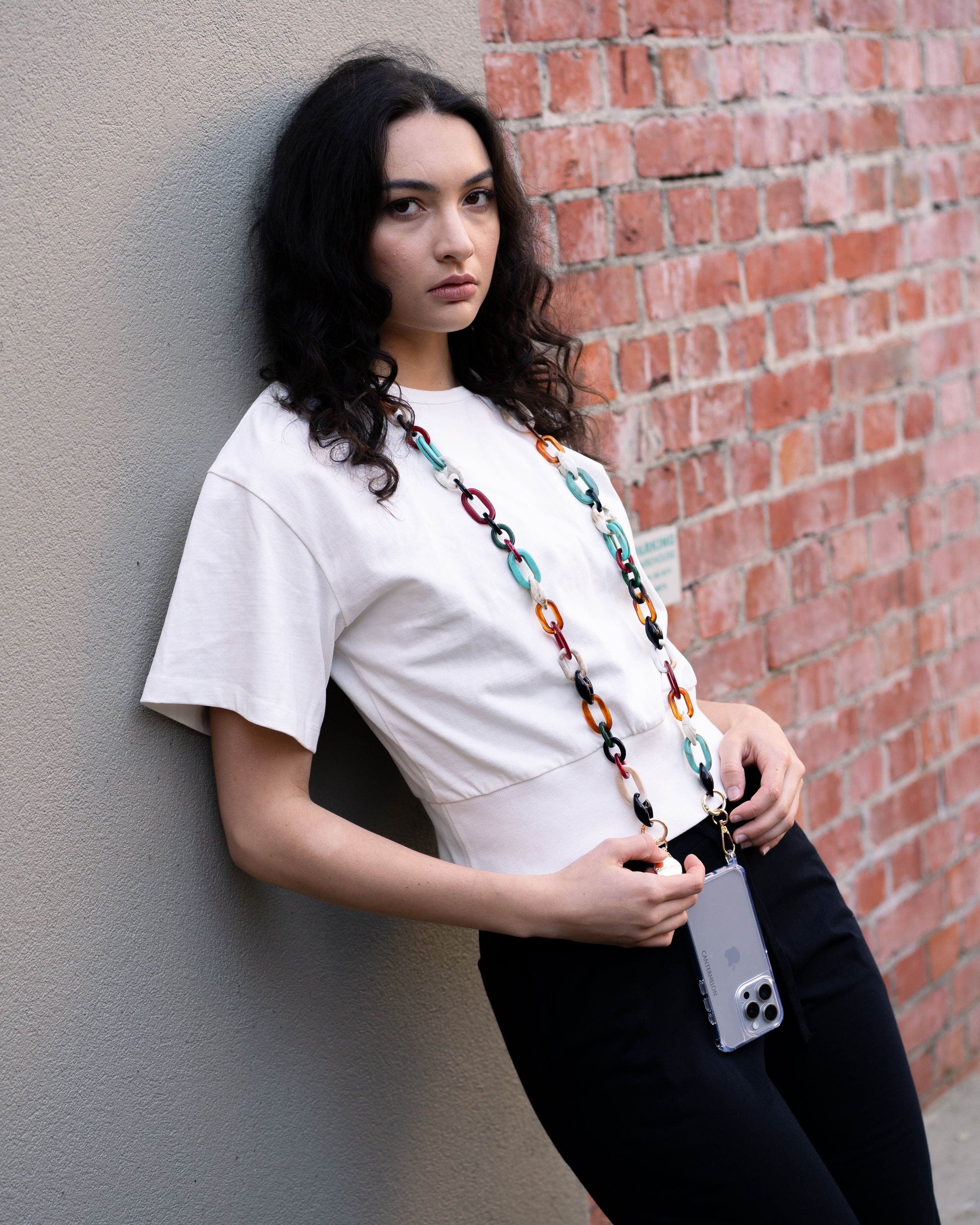 This resin link phonechain is made of high quality varied resin links, with sturdy stainless steel hardware. Designed with our collaborators in Europe, made for Aotearoa. The clasp also allows keys or swipe cards to be attached elegantly to your phone chain.