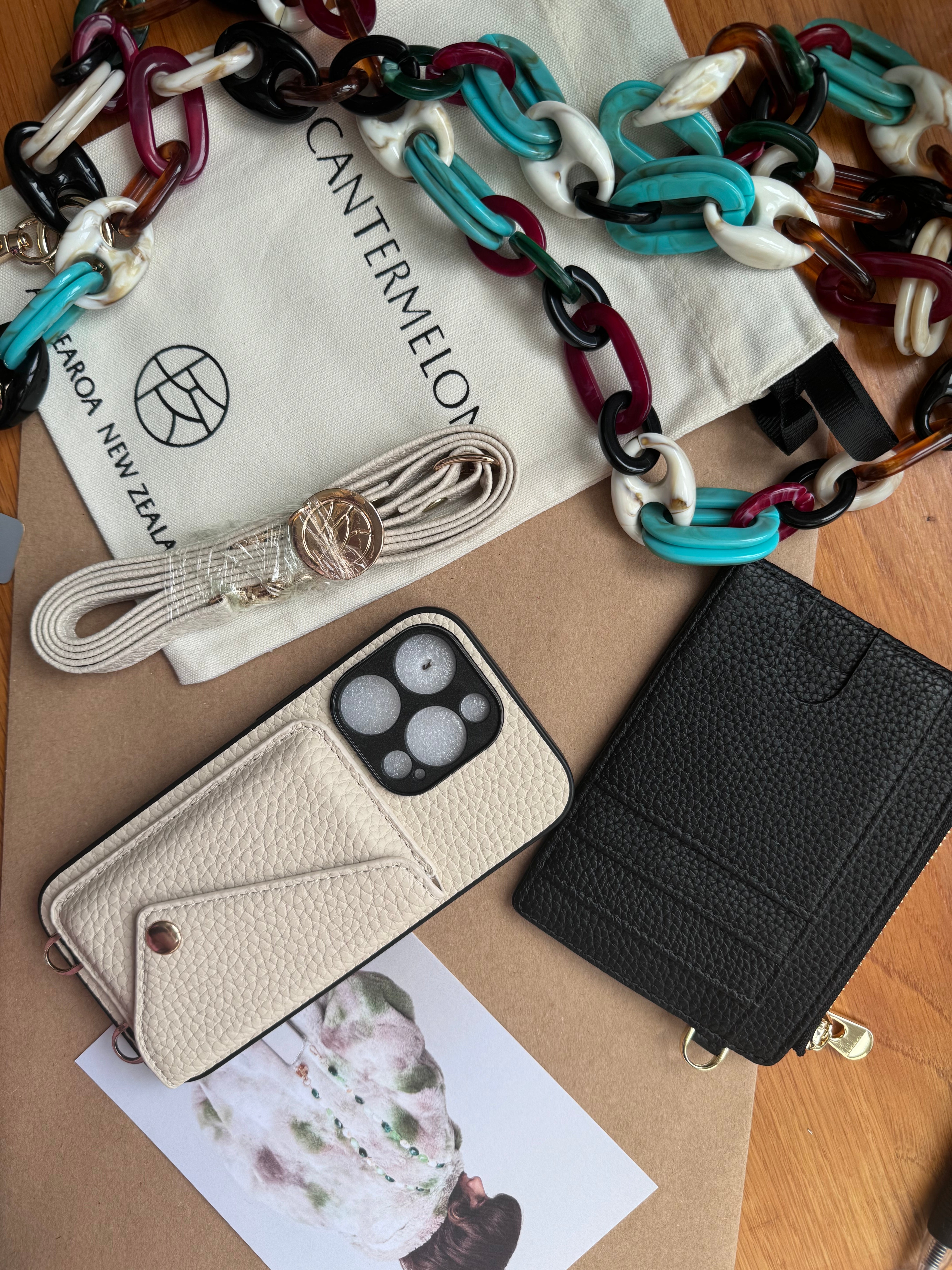 Attach this elegant and slim card sleeve to your phone chain, to carry your essentials with your phone.